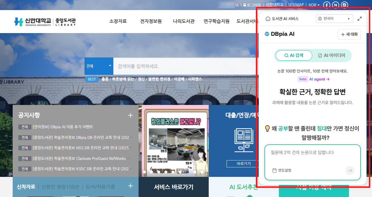 중앙도서관에서는 구성원의 학습과 학술연구 지원을 위해 신규 도입된 DBpia AI 서비스를 한시적으로 제공하고 있습니다.