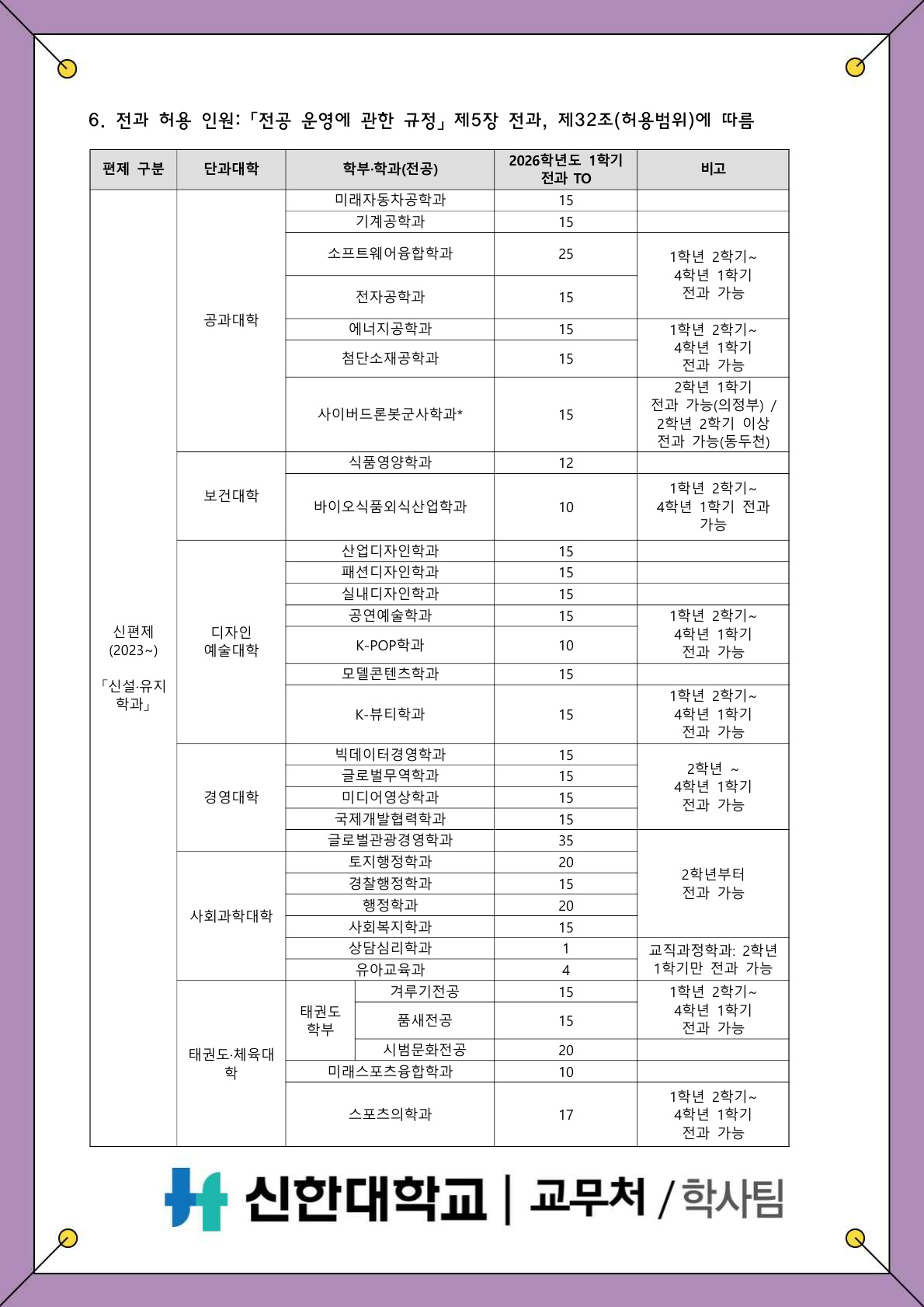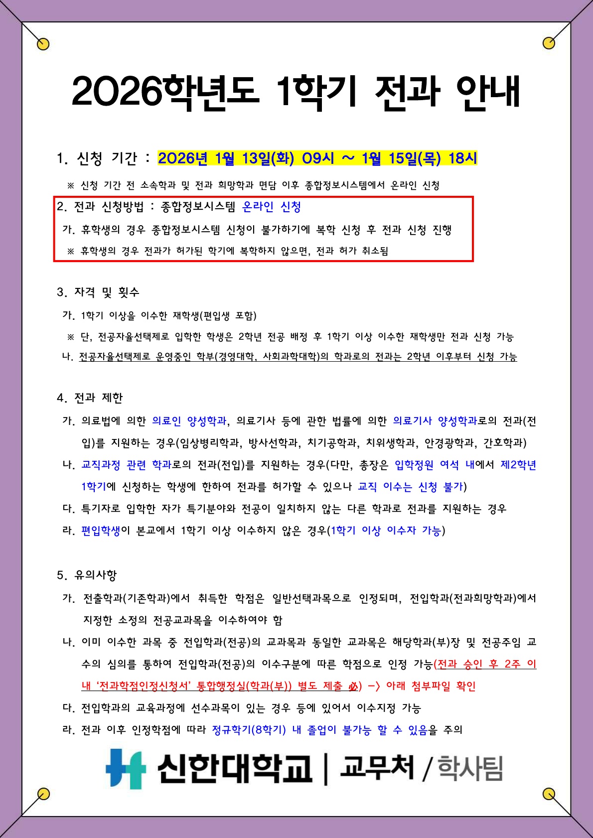 [학사팀/학적] 2026학년도 1학기 전과 안내