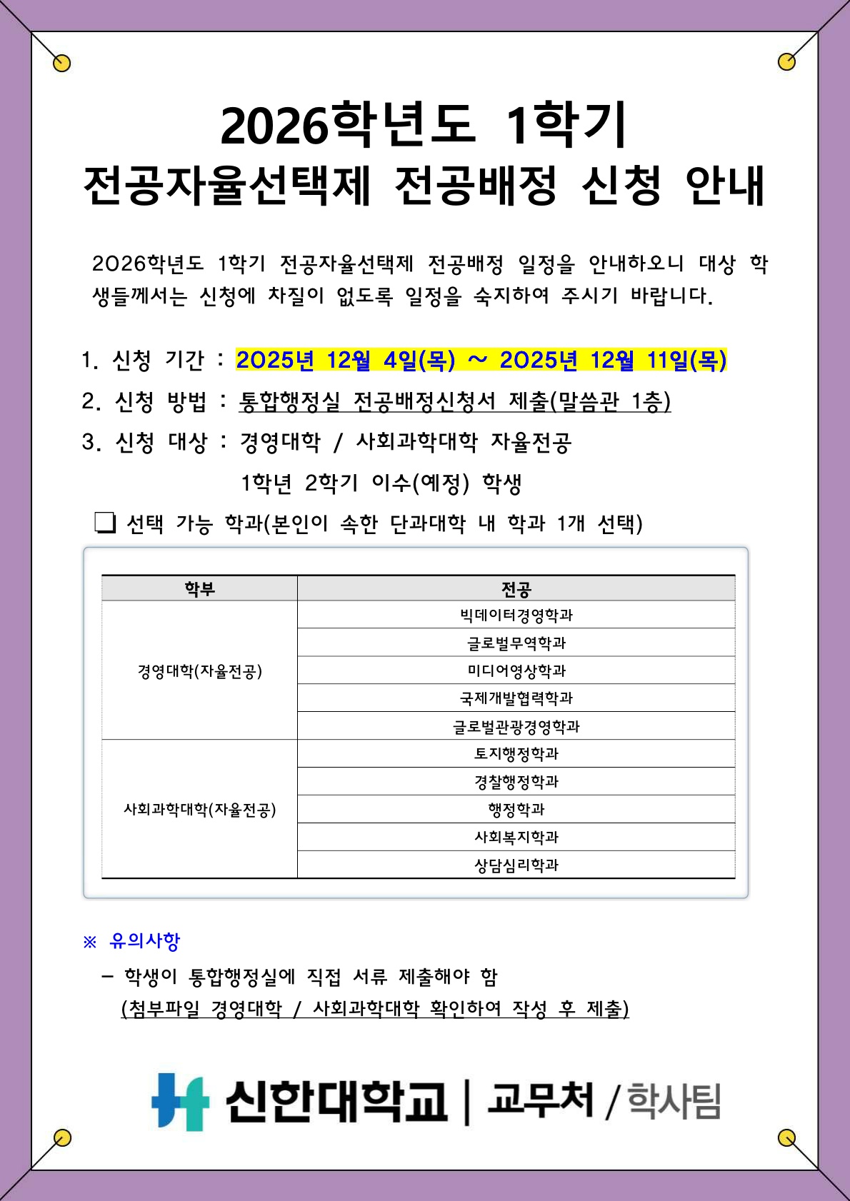 [학사팀/학적] 2026학년도 1학기 전공자율선택제 전공배정 신청 안내